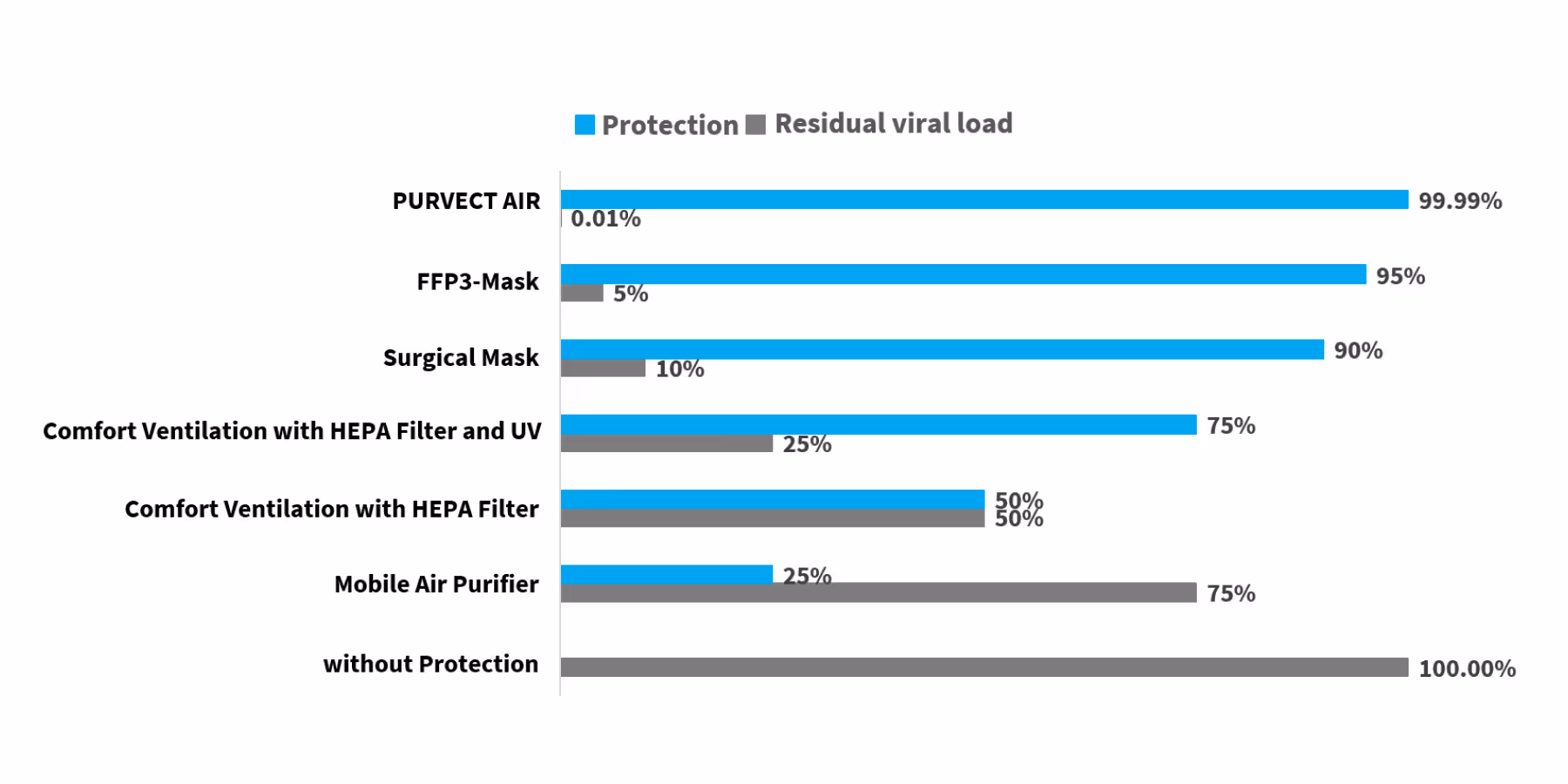 Purvection of indoor air protects against pathogens such as bacteria, viruses and fungi, with a scientifically proven effectiveness of 0.01% (the Fraunhofer Institute's measuring device measures precisely 2 places after the coma).
